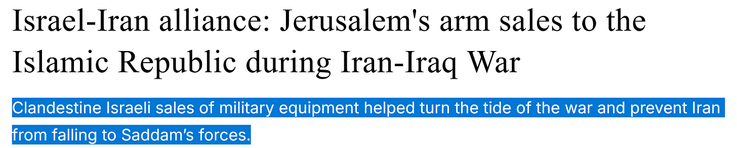It’s worth highlighting here for emphasis sake that Tel Aviv/Mileikowsky clamored for regime change against Iraq which simultaneously served Iran’s interests by driving the sectarian wedge proliferating both al-Qaeda death squads to radicalize destitute Iraqi Sunnis and Khomeinist death squads to radicalize destitute Iraqi Shi’ites in the power vacuum left after Saddamist Ba’athism was liquidated. Read that again: Iran and Israel were on the SAME SIDE in opposing Saddam Hussein. In addition, it’s a documented FACT that the “State of Israel” previously in the Iran-Iraq war brazenly abetted and sent arms to Ayatollah Khomeini against Saddam:37