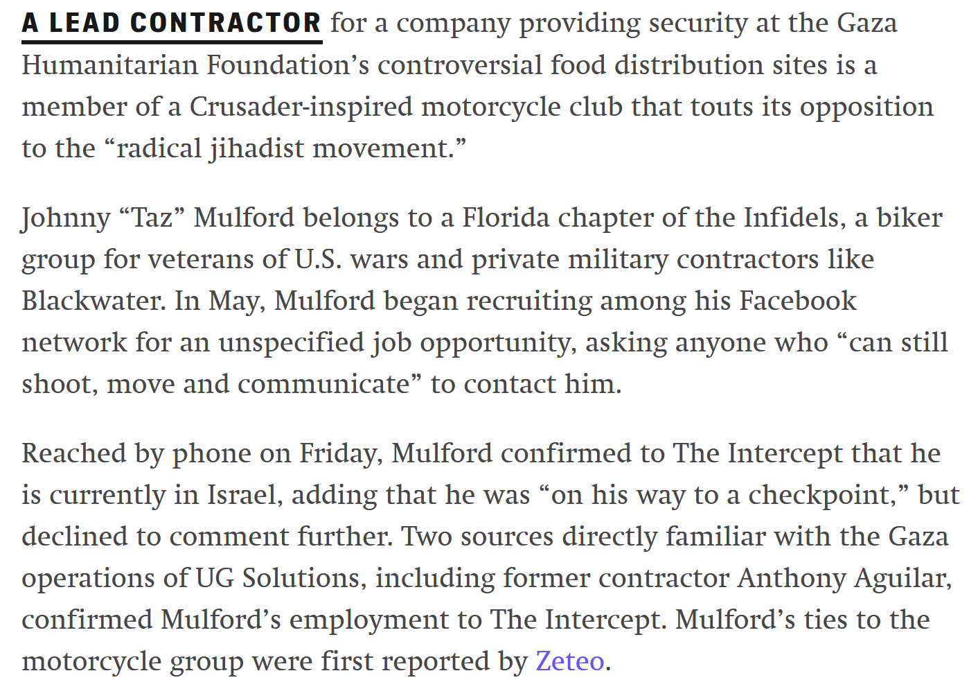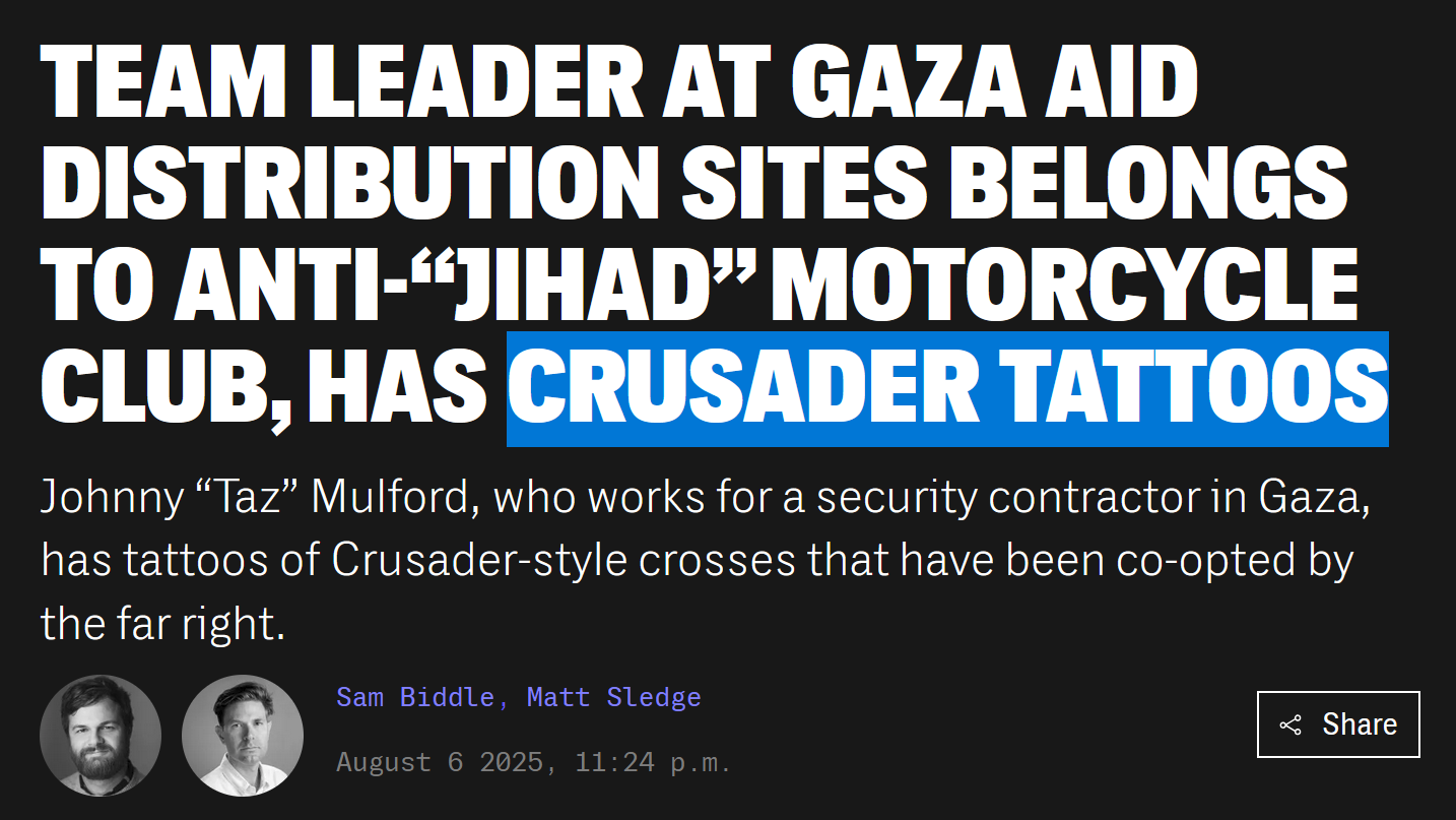 Sam Biddle, Matt Sledge (Aug. 6, 2025), “Team Leader at Gaza Aid Distribution Sites Belongs to Anti-“Jihad” Motorcycle Club, Has Crusader Tattoos,” The Intercept.